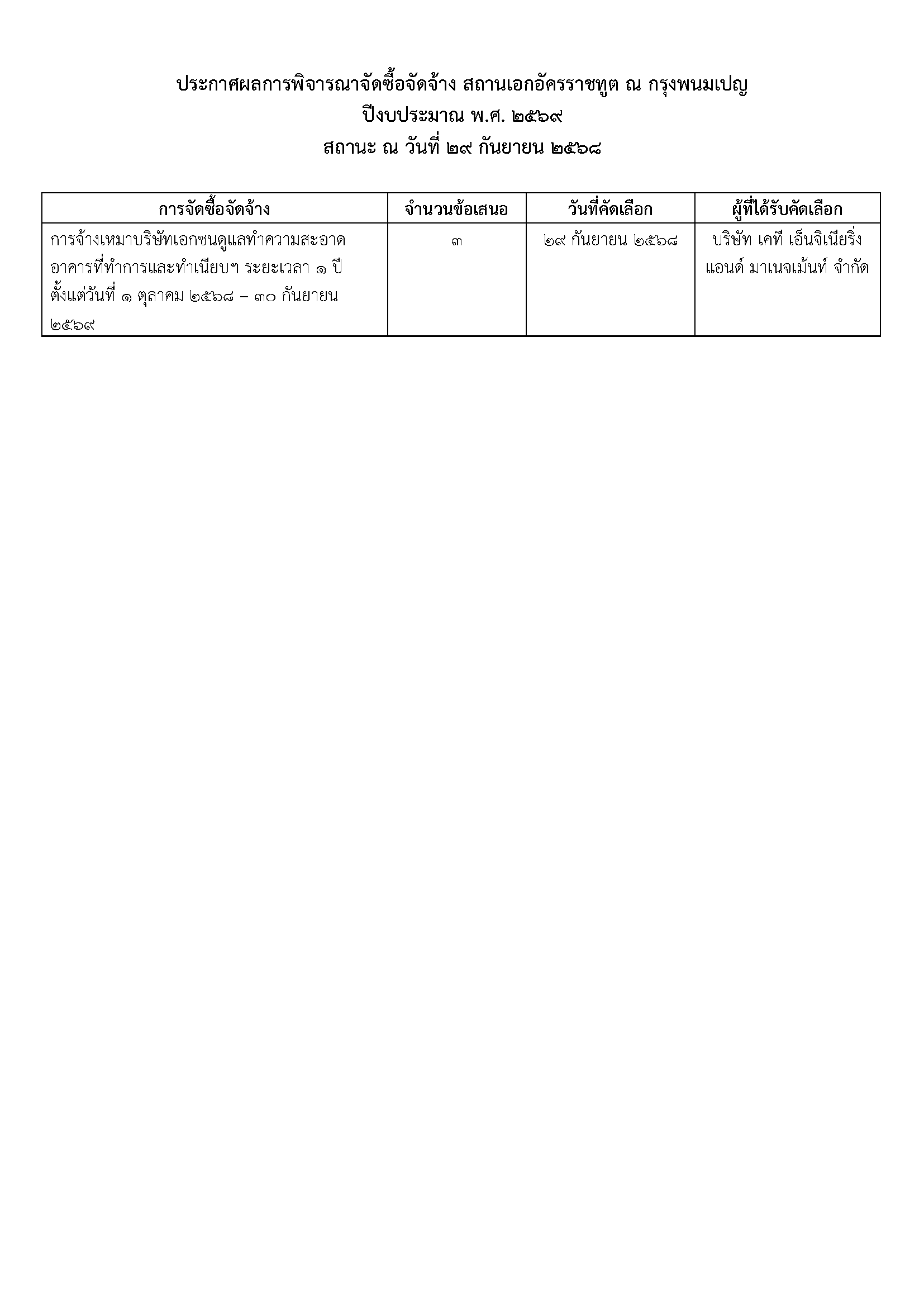 ประกาศผลการพิจารณาจัดซื้อจัดจ้างการจ้างเหมาบริษัทเอกชนดูแลทำความสะอาดอาคาร