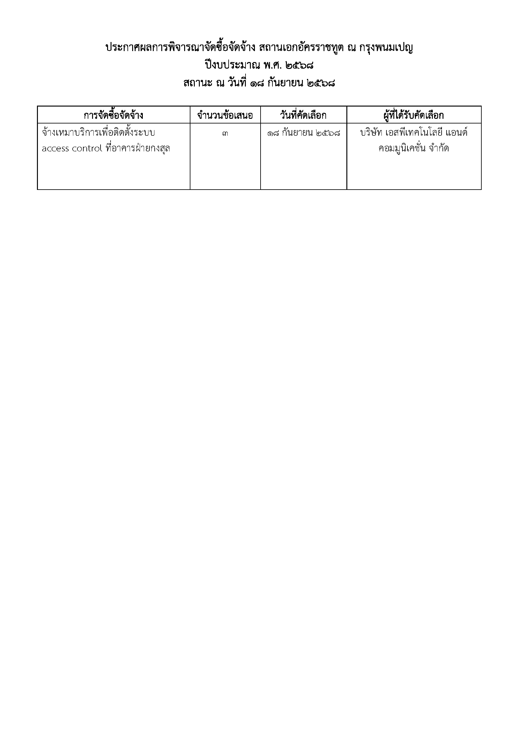 ประกาศผลการพิจารณาจัดซื้อจัดจ้างจ้างเหมาบริการเพื่อติดตั้งระบบ access control